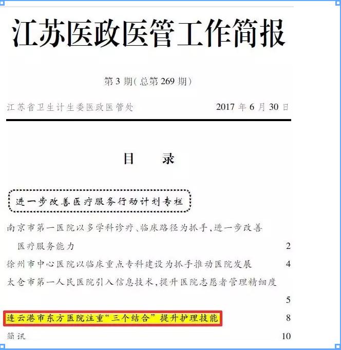日前,江苏省卫计委发布的《江苏医政医管工作简报》刊登了《连云港市东方医院注重“三个结合”提升护理技能》一文,这标志着我院先进的护理工作经验得到了省卫计委的认可,并在全省范围内推广。