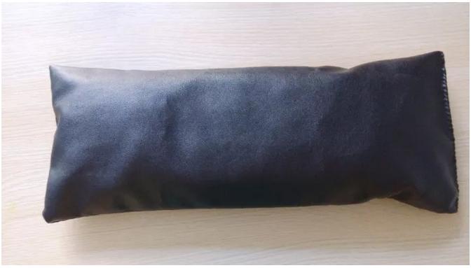 该颈枕制作简单,将棉布和牛皮革分别裁成32cm宽、42cm长。将棉布的底端、侧端缝好,顶端装一个小拉链制成15*40cm布袋,装上从市场购买且消毒好的荞麦皮300g,填充约四分之三左右。调整大小适宜后,装入皮革布缝好的袋子,封口,制成约38cm长、14cm宽的颈枕。