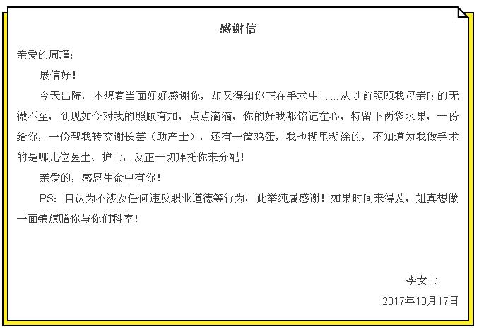 近日,李女士在东方医院妇产科顺利进行剖宫产,产下了一个8斤重的男孩。她在10天的住院时间里,得到了妇产科医护人员的精心治疗护理。在出院时,她留下了一份感谢信,仅借此表达对东方医院妇产科医护人员深深的谢意。