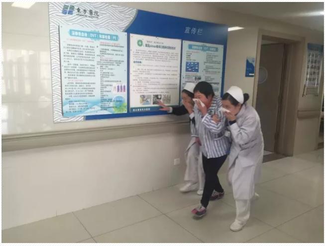 “着火了!着火了!”护士一边呼救一边迅速进行电话报警,按下消防报警铃,医护人员马上进入紧张状态。医生用灭火器对初期火情进行扑救,护士快速有序地搀扶病人向安全出口疏散。