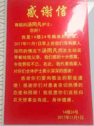 张大爷的孩子们得知这一善举,给汤同凡护士送来了感谢信。