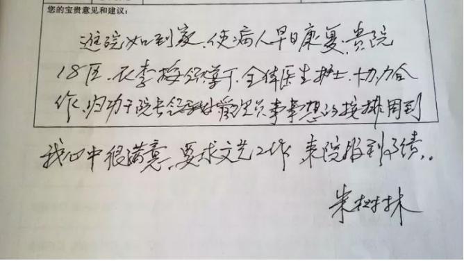 上图内容来自一位长期住院的87岁老大爷,也代表了好多呼吸内科病人的心声,希望全科医护人员再接再厉,共筑东方梦!