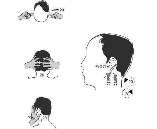 将双手掌心贴在左右脸上,往耳朵的方向擦过去,掌心擦过耳廓,一直擦到脑后,然后“原路返回”,做20次。注意,从脑后擦到脸前的过程中,掌心在经过耳朵时,一定要将耳廓折叠起来。