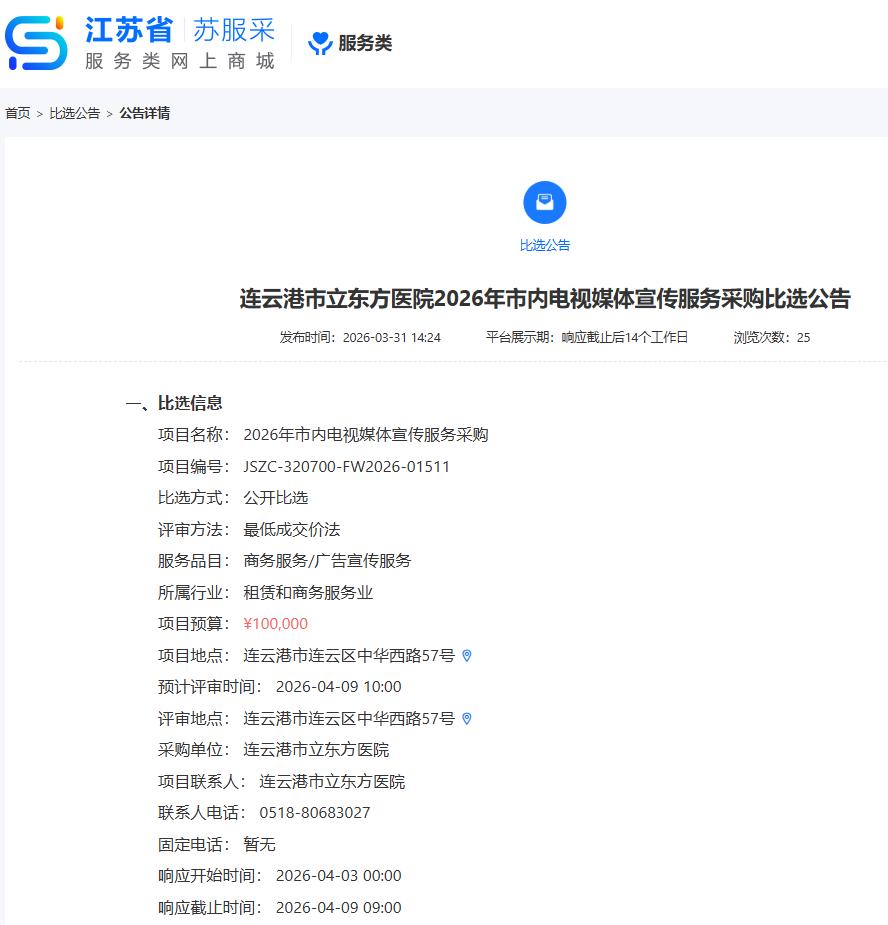 连云港市立东方医院2026年市内电视媒体宣传服务采购比选公告已通过江苏政府采购网苏采云苏服采平台发布,网址如下:https://js.fwgov.cn/biddingAnnouncement/2036259748563120130?type=1&serviceType=1&name=required。