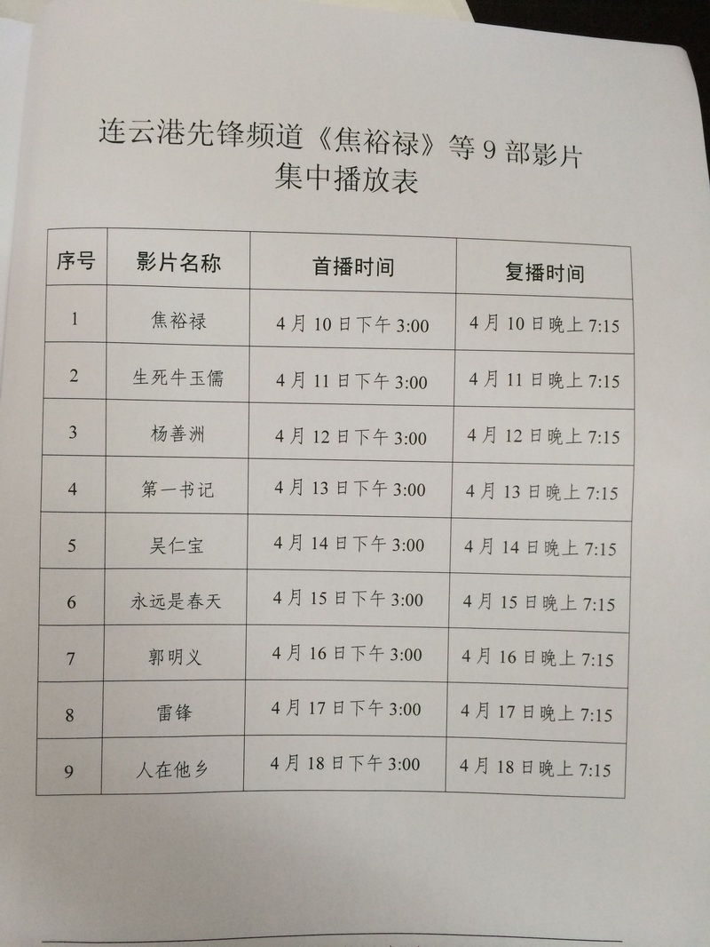 附:连云港先锋频道《焦裕禄》等9部影片集中播放表