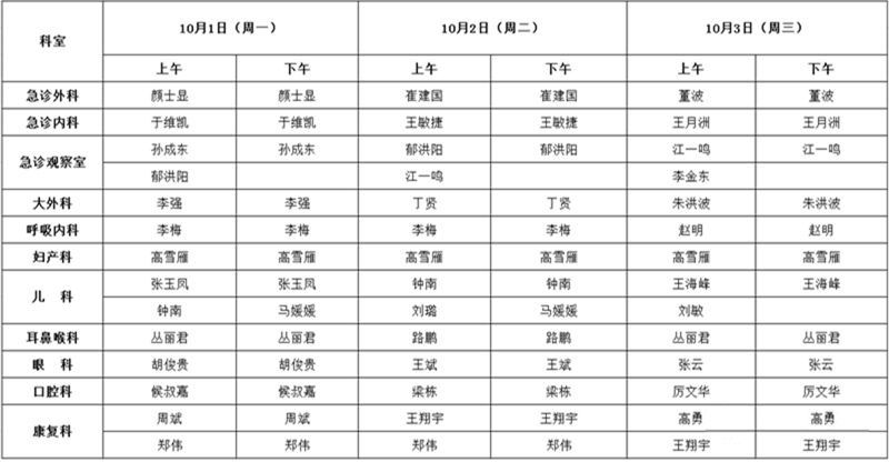 我院国庆期间值班安排
