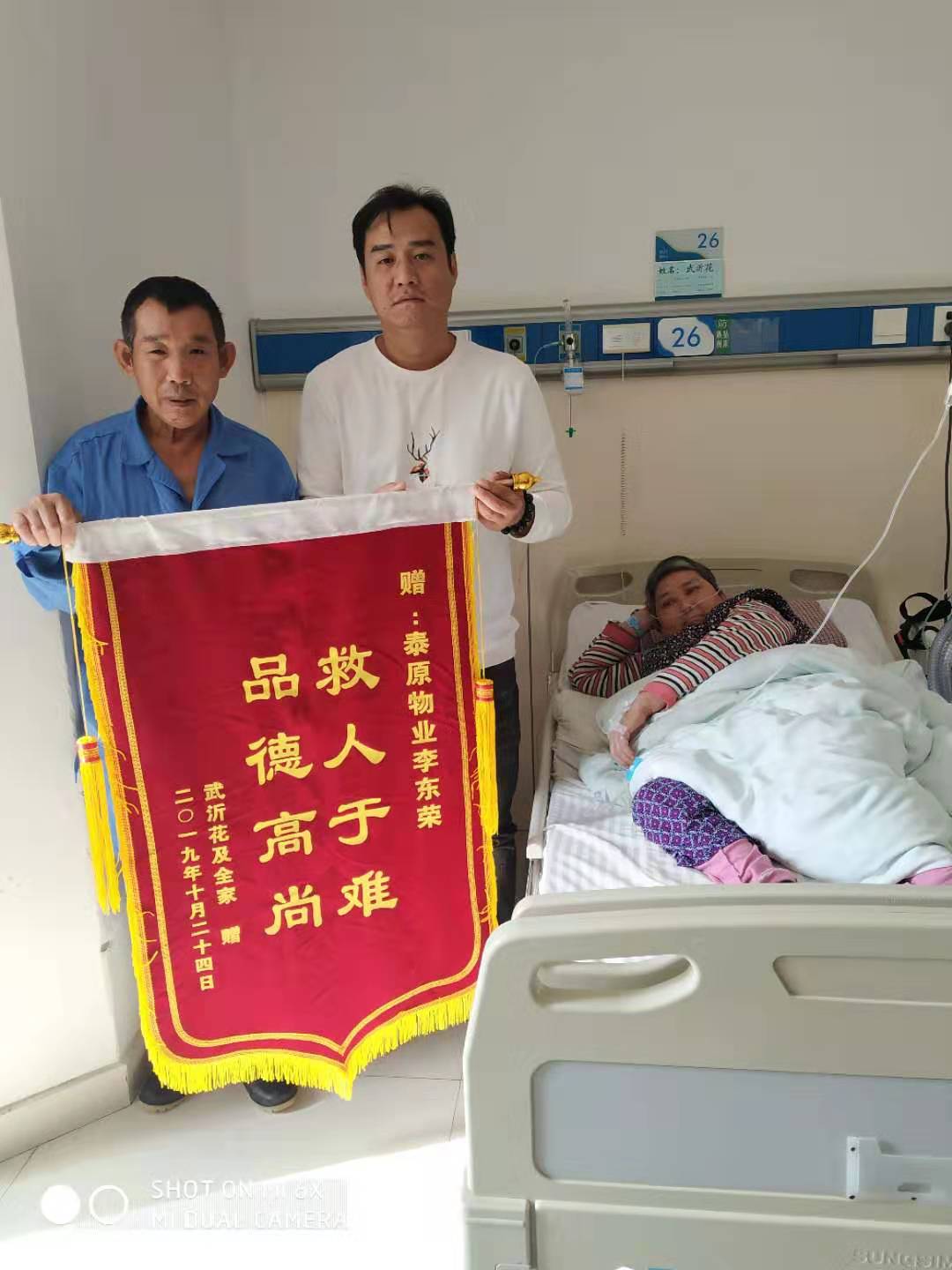 原来,10月21日早上呼吸内科26床患者武沂花在上卫生间时身体突发不适,摔倒昏迷,当时病房里并没有其他人,保洁员李东荣在做保洁时发现病人摔倒后,第一时间通知了护士站,并及时将老人从地上抱起,一起配合医生护士将老人放到床上急救,使得老人转危为安。