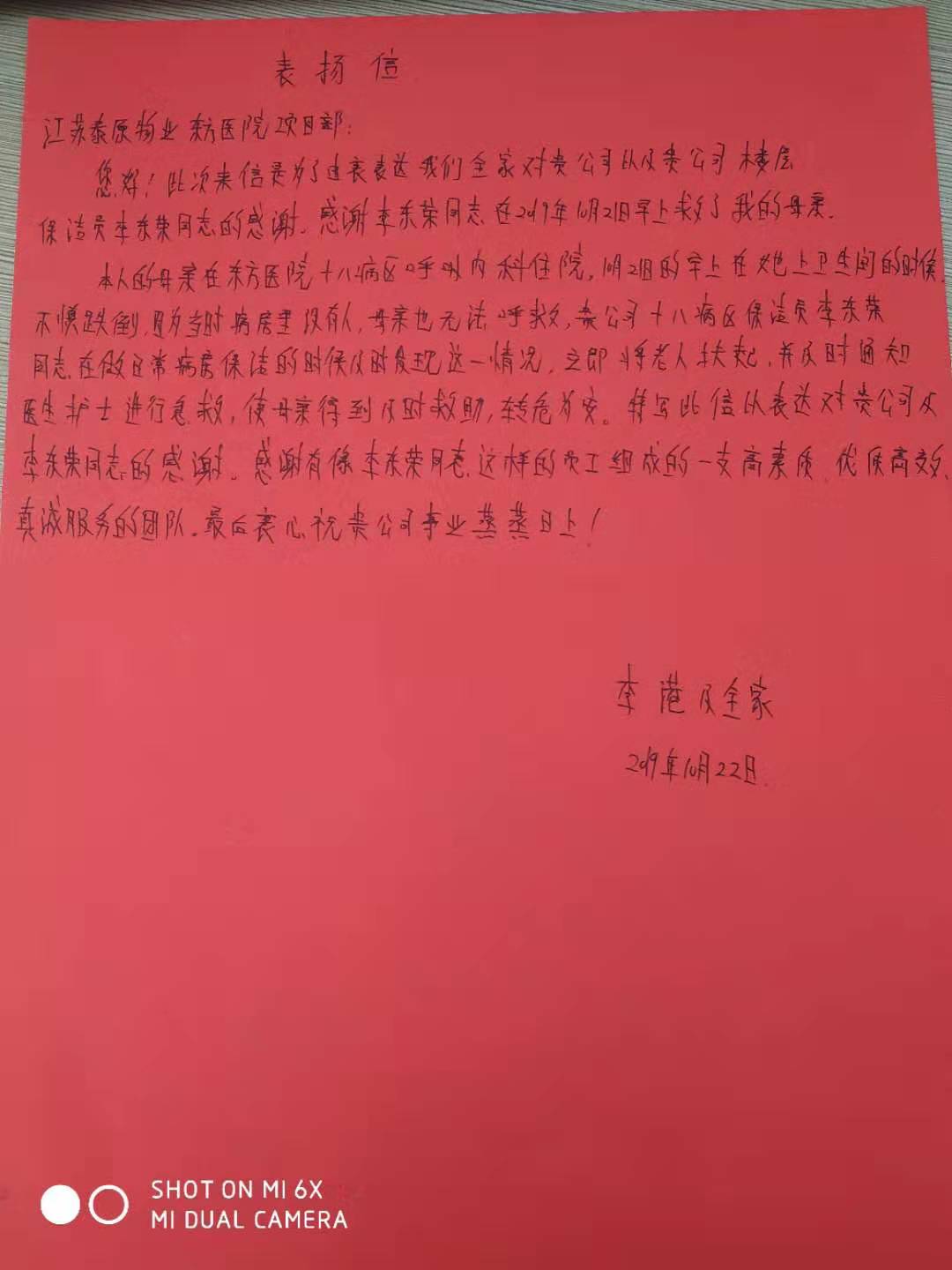 江苏泰原物业服务有限公司东方医院项目部十八病区保洁员李东荣近日收到了来自十八病区呼吸内科26床患者武沂花及全家赠送的锦旗及感谢信。