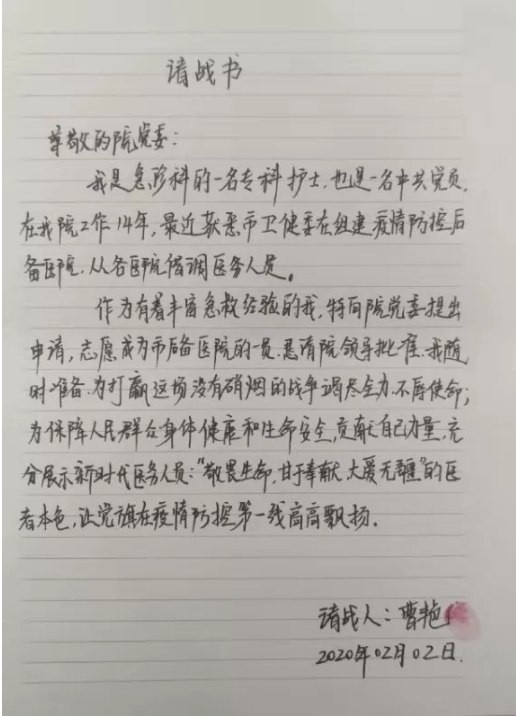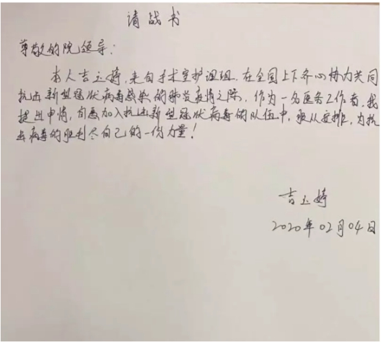 吉玉婷看到通知后,第一时间就写下了自己的请战书,请战书中写道:“作为一名医务工作者,我提出申请,自愿加入抗击新型冠状病毒的队伍中,服从安排,为抗击病毒的胜利尽自己的一份力量!”简短而又有力量的请战书,透露出她无畏的勇气和坚定的信念。为了不让家人担心,吉玉婷从始至终都没有和家人说,独自踏上了去往隔离点的路。