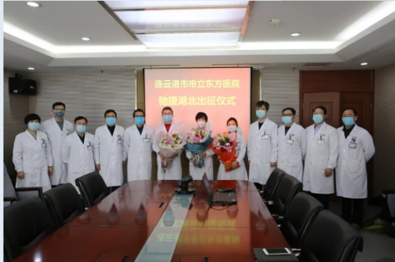 医院为唐新仿(右五)一行举行出征仪式