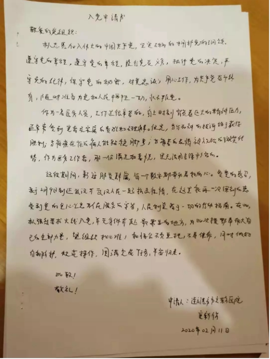 到达武汉的第二天,受到周围党员的感召,同时为了奔赴到最前线,最需要的地方,我火速写了入党申请书。