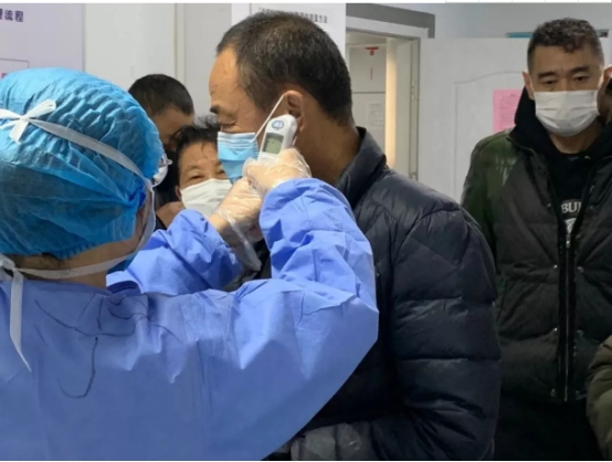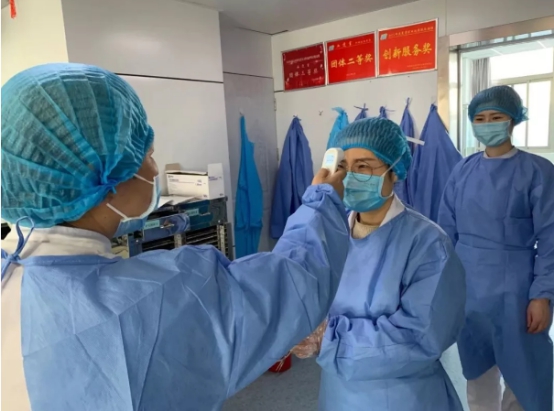 万秀贤主任给患者测量体温,合格后才能进入血液净化中心进行治疗