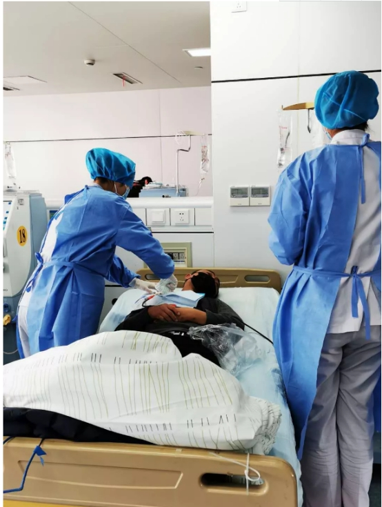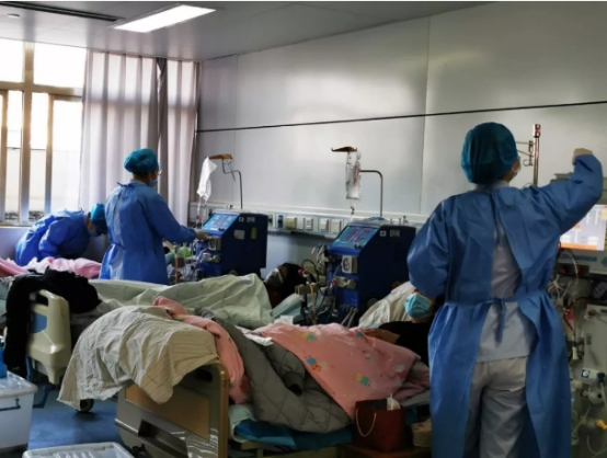 因此,无论疫情如何紧急,血液净化中心医护人员都必须保证尿毒症患者的规律治疗。只因为生命重托,义不容辞。作为逆行者的他们始终坚持在血液净化中心的工作岗位上,医护人员们从早上7点到晚上8点一直忙着做好病人的治疗与照护。