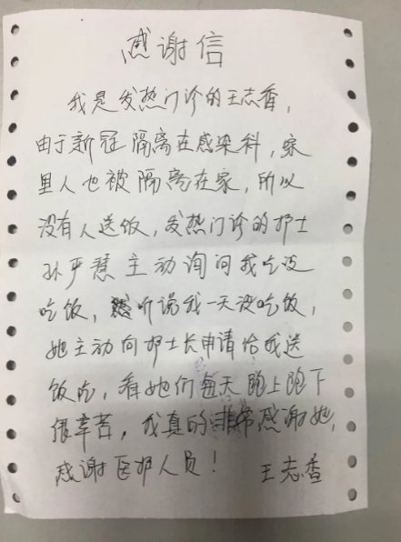 在隔离病房工作的这段期间,让我印象最深刻的是其中一个病人。她和家人都被隔离了,她自己非常担心,一遍一遍的问我检查结果,我不厌其烦的给她解释:“结果出来我会第一时间告诉你。”得知她已经一天没有吃饭了,我一边安抚她,一边给她订餐。我和她说:你一定要相信国家,相信政府,相信我们,我们大家一块努力,一定能战胜疫情!后来,她的心情明显放松多了。出院的时候她写了一封感谢信,看着饱含深情的文字,我觉得所有的付出都是值得的。