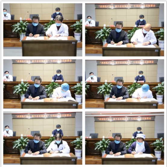 会上,院长谈笑与临床、医技主任,护士长和职能部门负责人签订了《患者满意度提升目标责任书》。
