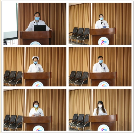 监察室主任徐攀(左上)通报评测情况,儿科主任苏海燕(右上)、放射科主任张名忠(右中)、检验科主任李海英(左下)、规财处处长徐春(右下)、十六病区护士长马丽(左中)分别作表态发言