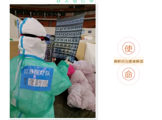 到达武汉后,唐新仿经过紧张的培训,立即投入到疫情救治工作中去。征战在防控疫情最前线,她不仅要牺牲与家人团聚的时光、要吃苦,还要面临种种不可知的风险。在工作中为了节约防护物资,上隔离病房前及期间不吃不喝,有一天晚上7:30才吃到当天的第一顿饭。