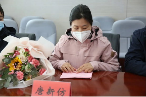 △唐新仿代表3位援鄂医疗队队员讲话