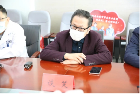 院长谈笑代表院党委热烈欢迎三位勇士平安归队。谈院长表示虽然你们都来自平凡的岗位,但在全国疫情最严峻时刻,湖北抗击疫情主战场最紧要关头,你们响应党的号召人民的需要,遵从爱和使命的呼唤,主动请缨,义无反顾,挺身而出,勇敢逆行。一个多月以来,你们日夜奋战,护佑生命,不负重托,不辱使命,圆满完成了市委市政府、院党委交给你们的任务。