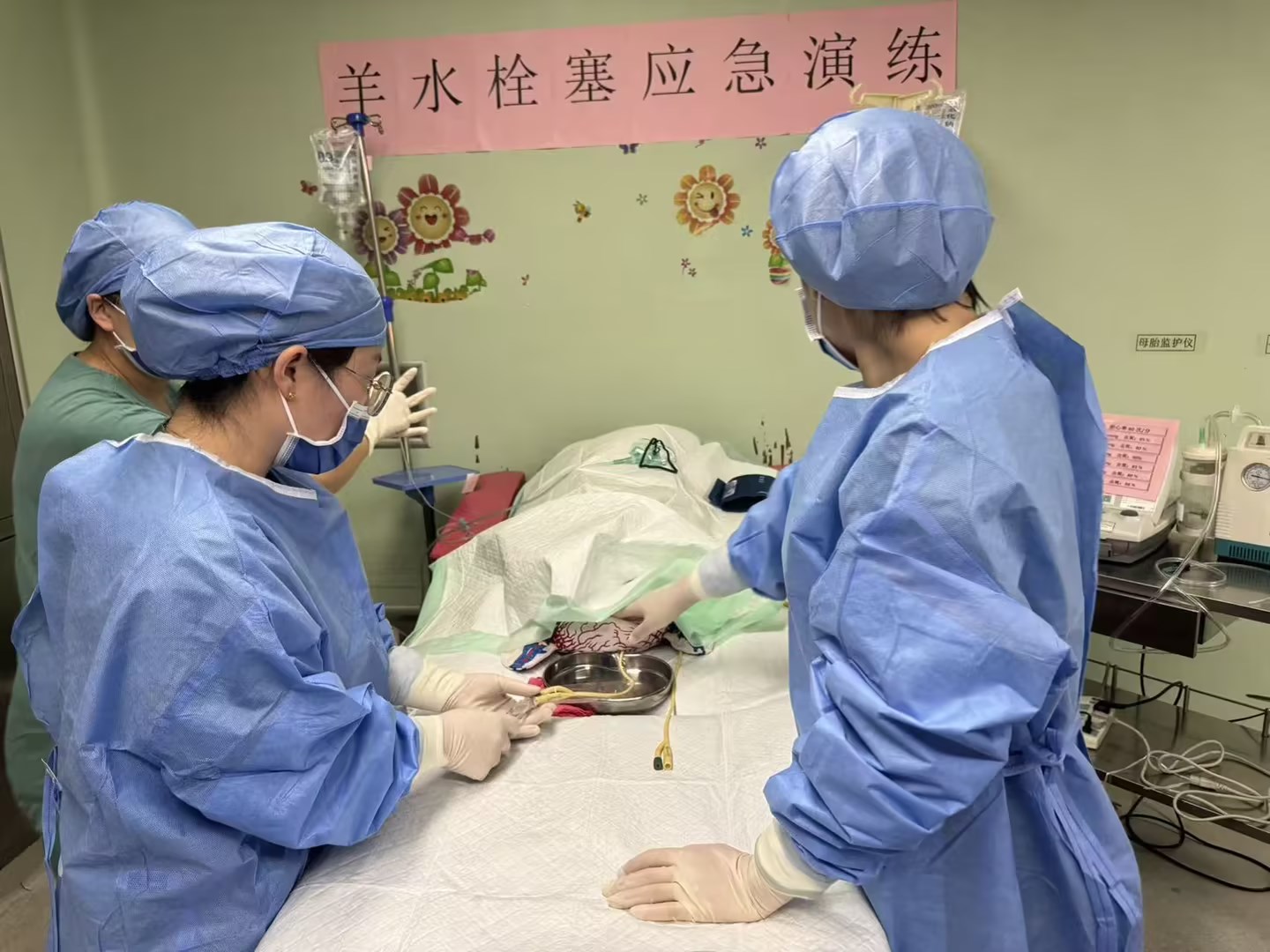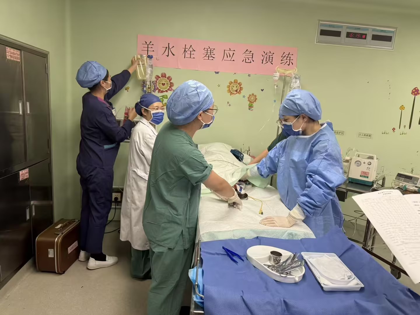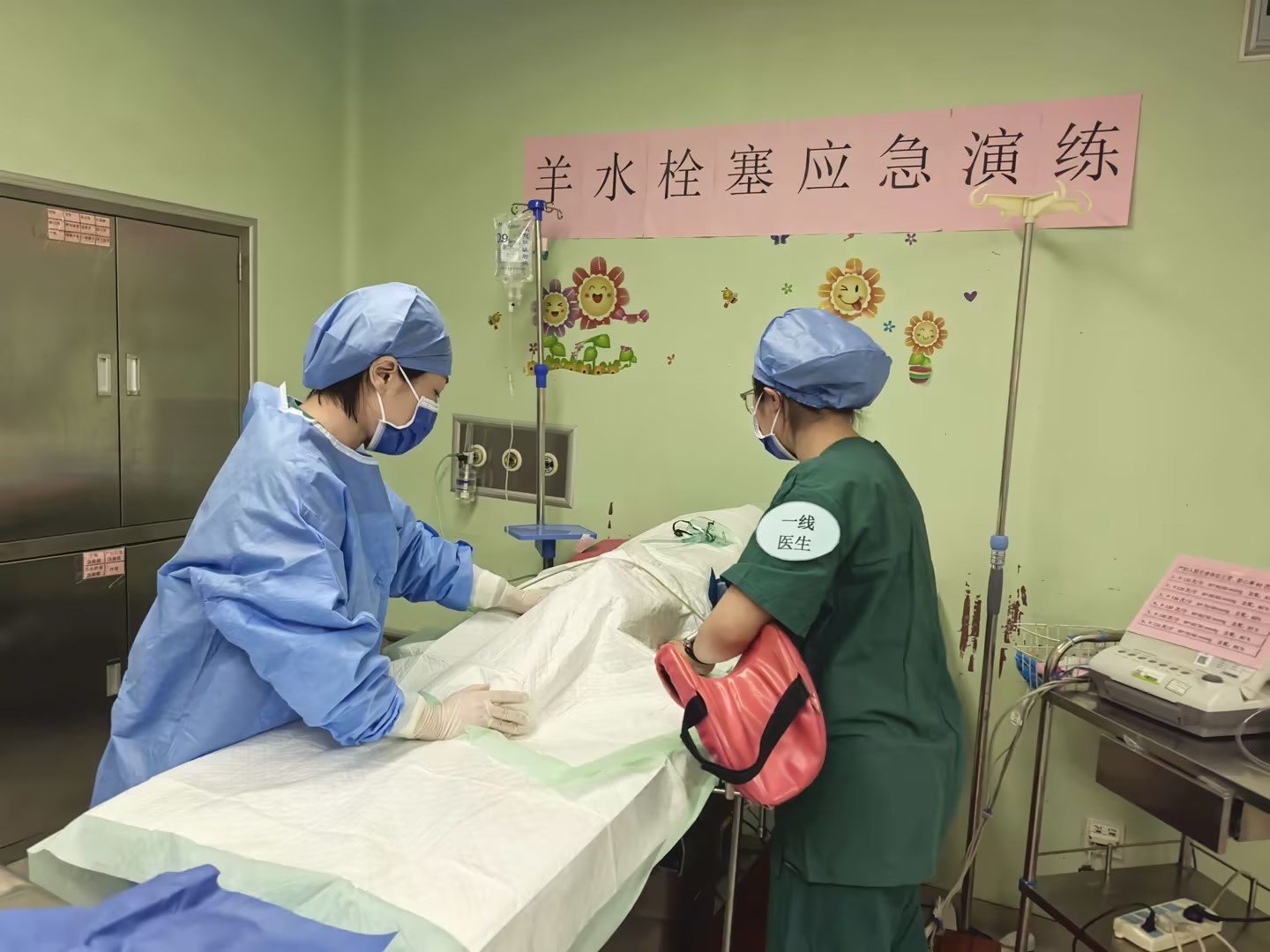 “患者,李xx,32岁,孕39周,自然分娩后突然出现胸闷、呛咳、烦躁不安,血氧饱和度急剧下降!”下午3时,演练在产房拉开序幕。助产士发现“产妇”异常后,立即大声呼救并实施初步处理。产科主任迅速到场,根据典型的临床症状,果断做出初步判断:“高度怀疑羊水栓塞!启动羊水栓塞抢救应急预案!”