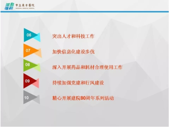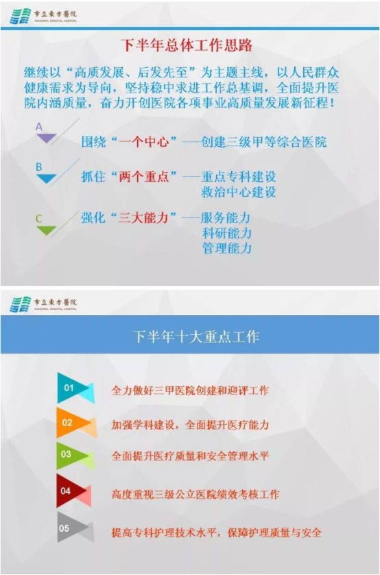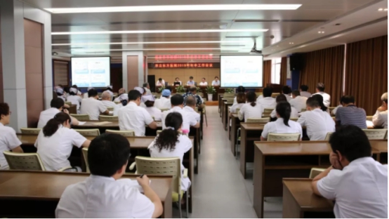 谈院长用100余页的幻灯片,分别从医院运行质量、医疗服务能力、质量安全管理、护理内涵建设、人才队伍建设、科研教学能力、信息化建设、服务保障水平、药品耗材监管、党建和行风建设等十大方面,全方位地回顾了我院上半年所取得的显著成绩。