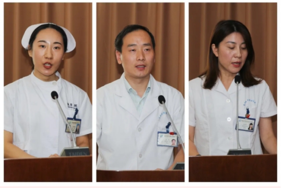 普外科护士李玉鸽(左)、监察室主任徐攀(中)、门诊一支部书记王新颜(右)分别作表态发言