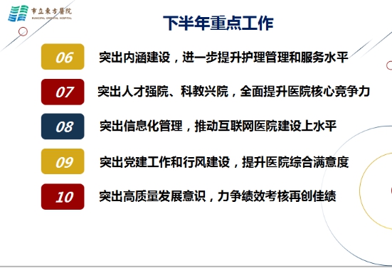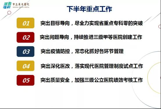 下半年,将是全面完成年度目标任务的关键时期,也是省临床重点专科和三级甲等综合医院创建、迎评的重要阶段。谈院长从十大方面,对下半年工作提出了具体要求。