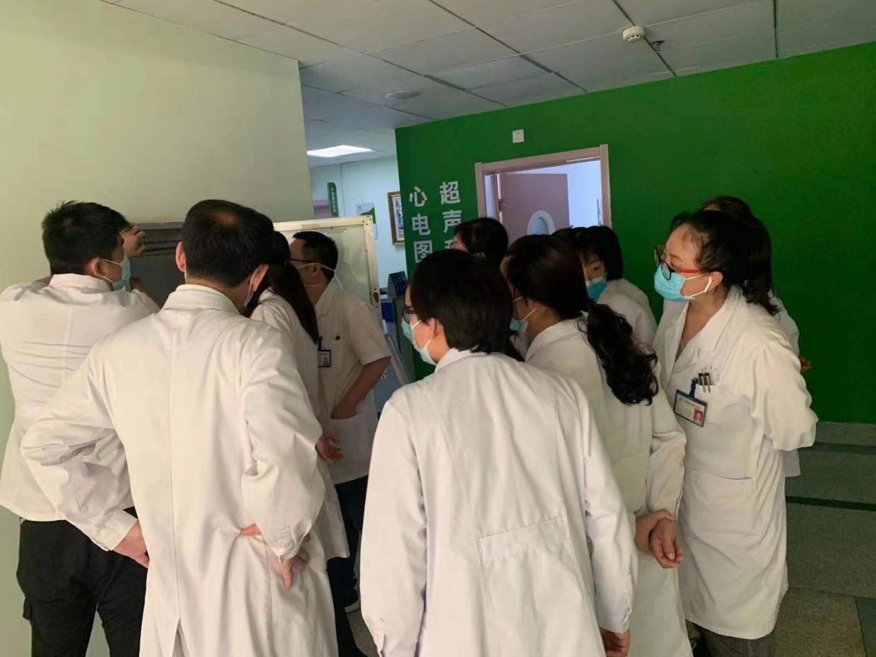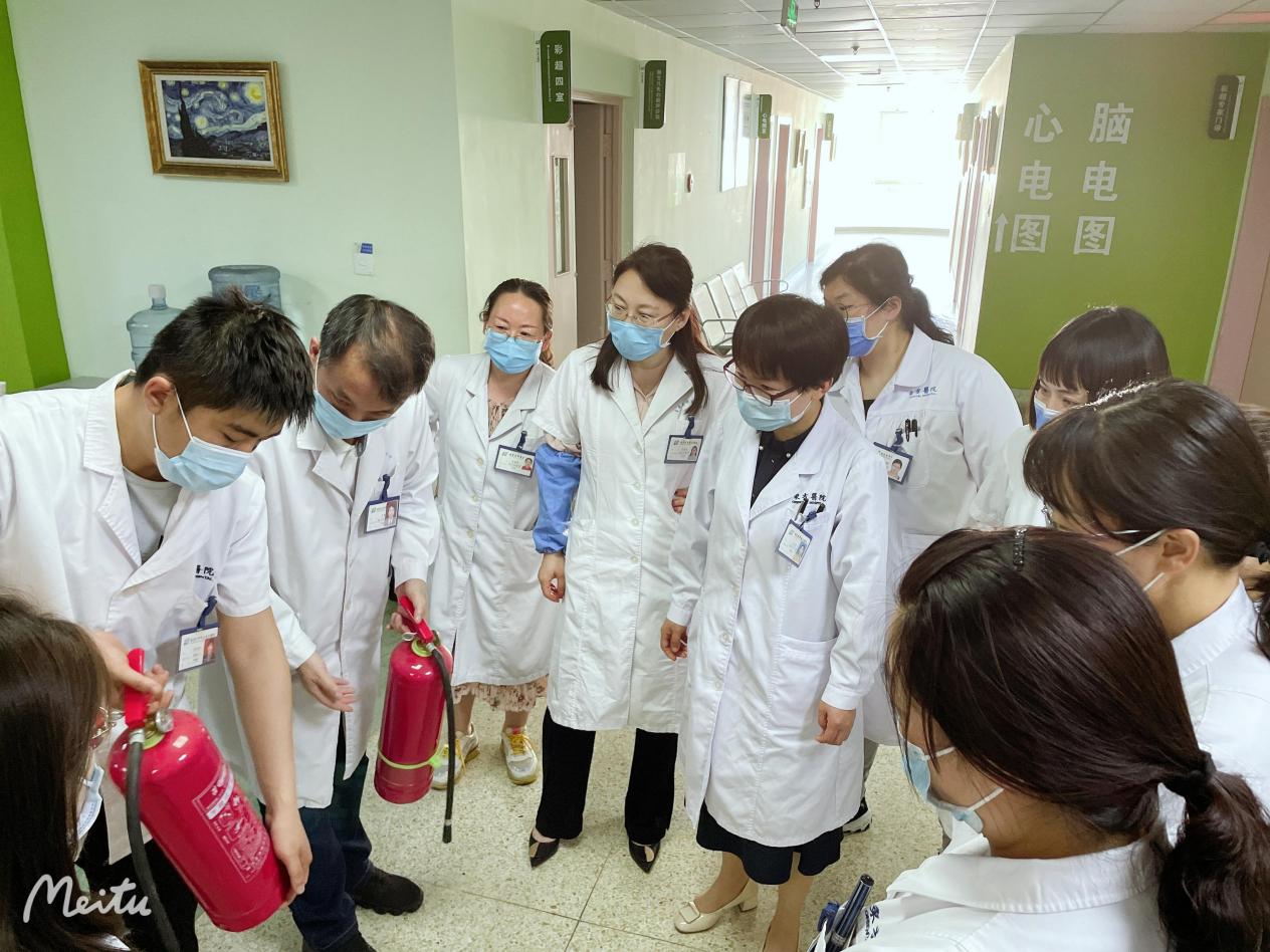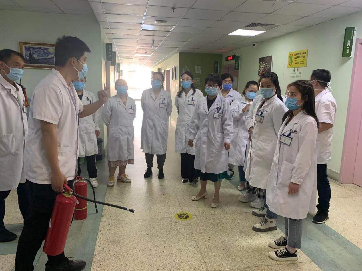 5月28日下午,超声影像科和心电图室在参加完线上消防培训后,为进一步提高我院超声影像科、心电图室医师的应急处置能力,又邀请我院保卫处到门诊三楼进行实地指导演练。